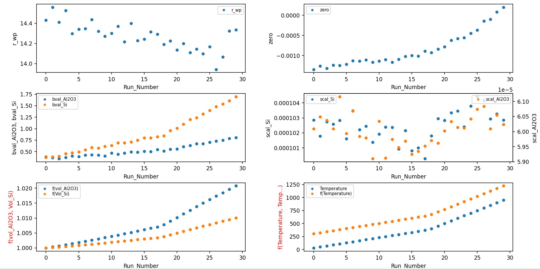 It’s so quick to perform multiple data analyses using Topas that it often takes longer to visualise/plot results than to do the Rietveld refinements. I now use a python script like plot_all.py to do this, as described above. You will need to install matplotlib and pandas to run this.