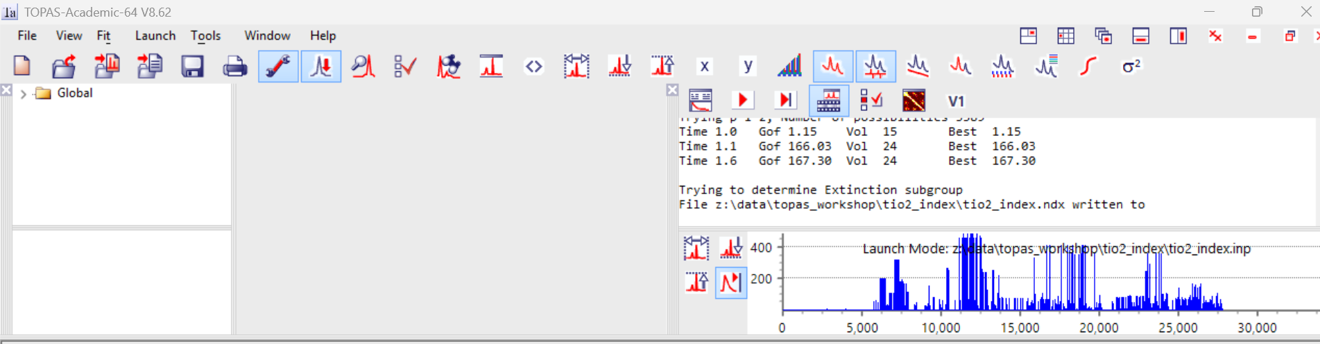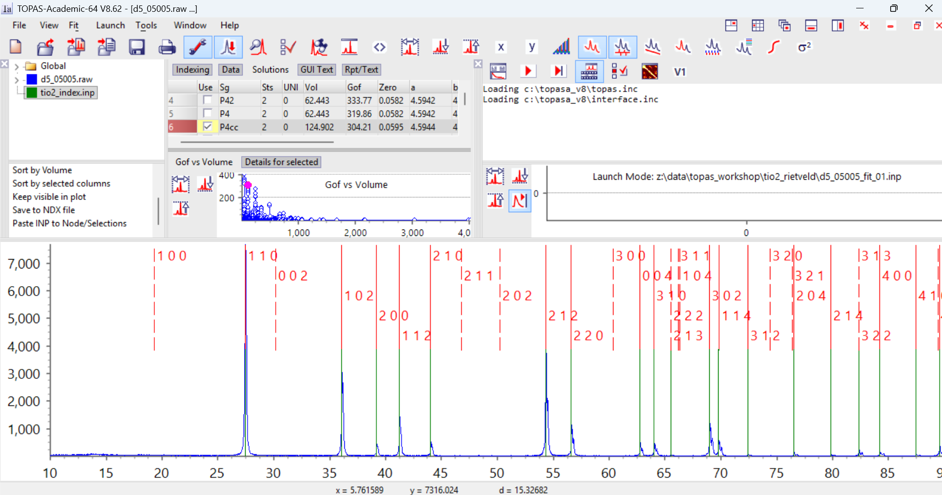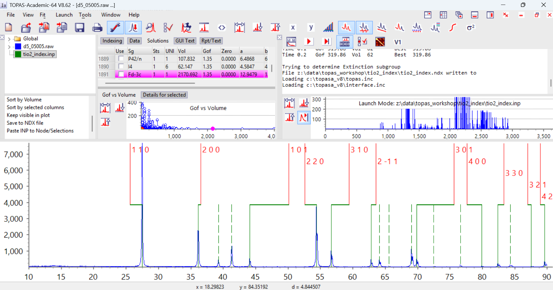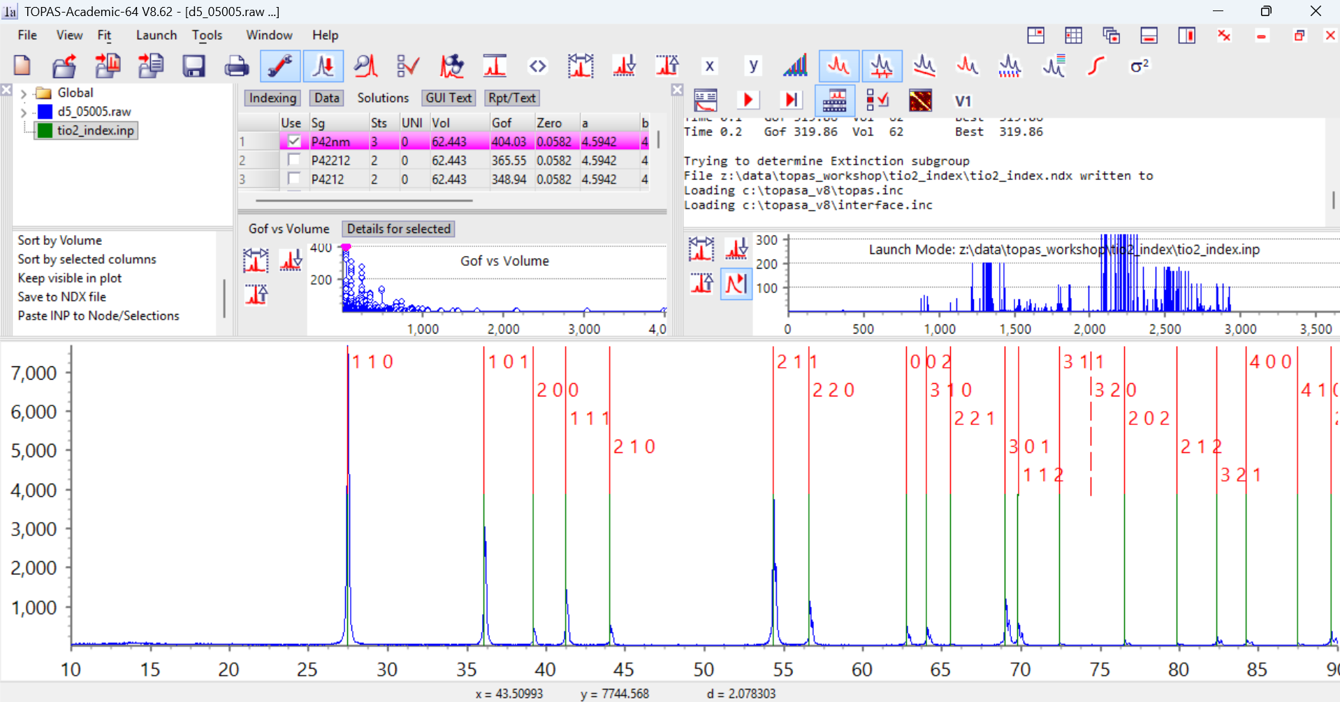 Learning outcomes: How to index a powder pattern in TOPAS from an INP file, then how to visualise the indexing results in the gui. See Alan’s J. Appl. Cryst. paper for details of the algorithms used.