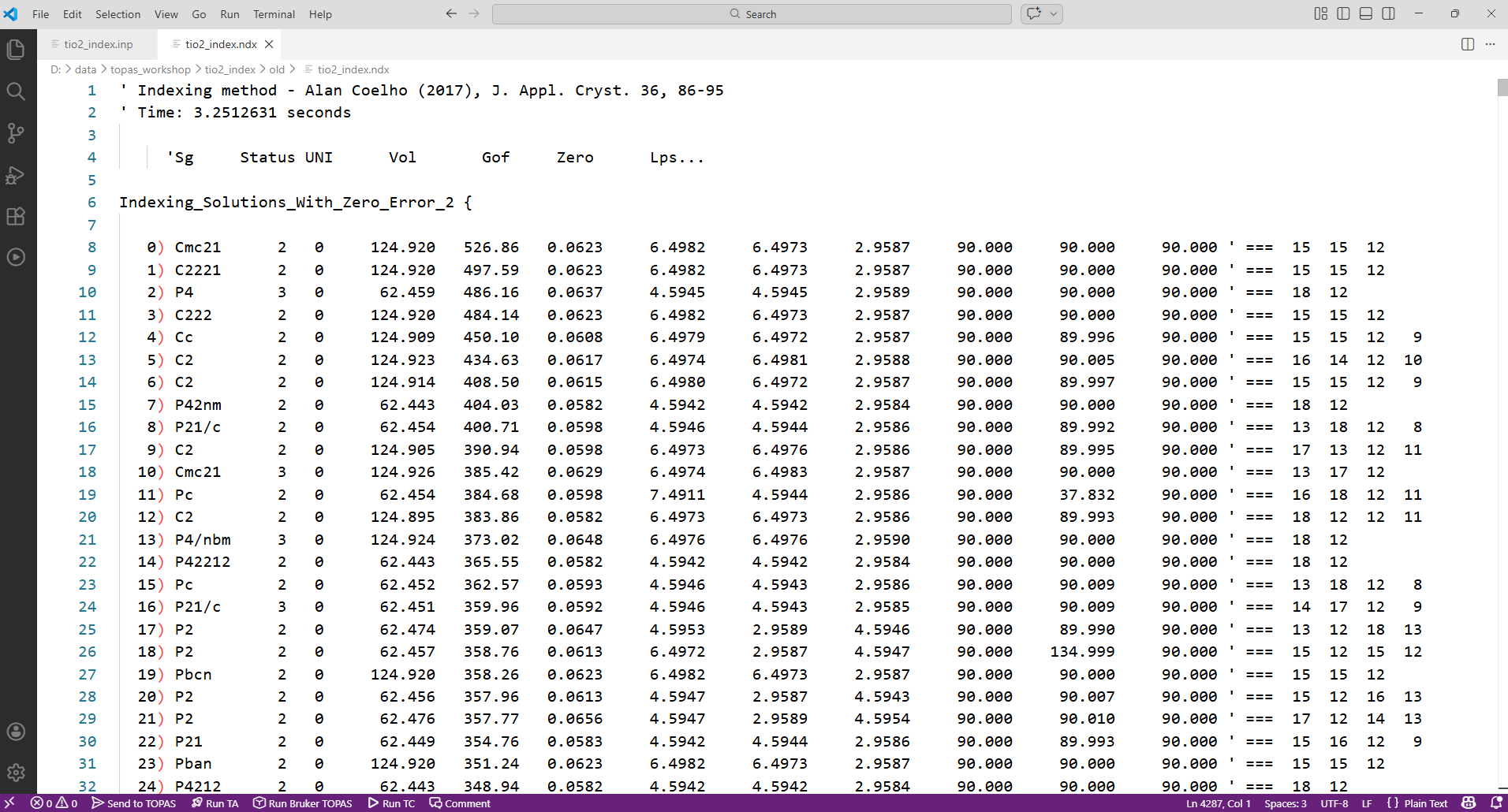 4. Indexing results get written to a file called tio2_index.ndx. Open this in topas-editor. It should look something like the image below. The unit-cells are ordered by their GoF. Here the best cells have a GoF ~ 500, and the worst around 0.14.
