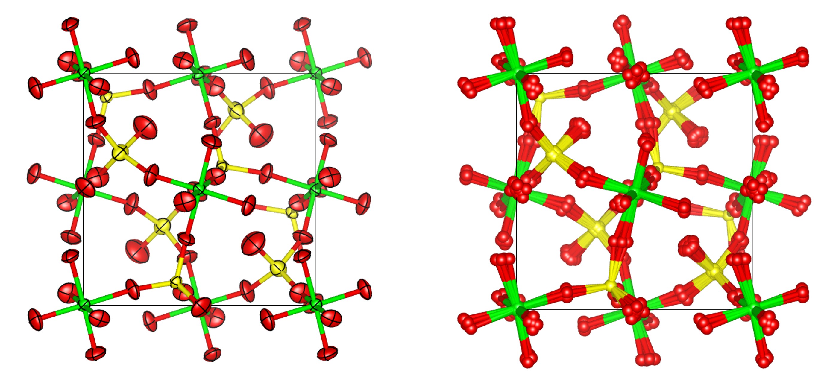 10. Add the command “view_structure” to the str section. You should see a model that looks something like the image below. The image compares 90% probability surfaces for the anisotropic displacement parameters in the ideal structure with the atomlet positions from the ADP_5 model. The figure shown is actually from a fit to experimental data.